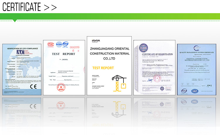 La scheda standard del MgO di OCM è Una scheda chiara. La sua densità è Di meno che 1300kg/m3. Allo stesso tempo la sue resistenza alla flessione e resistenza all'urto è Eccellenti. Inoltre, effettuerà La sua qualità Durante la costruzione. È Chiara, esso può Salvare il tempo, lo spazio, il peso e la spesa. È Una nuova ed alta parete efficiente